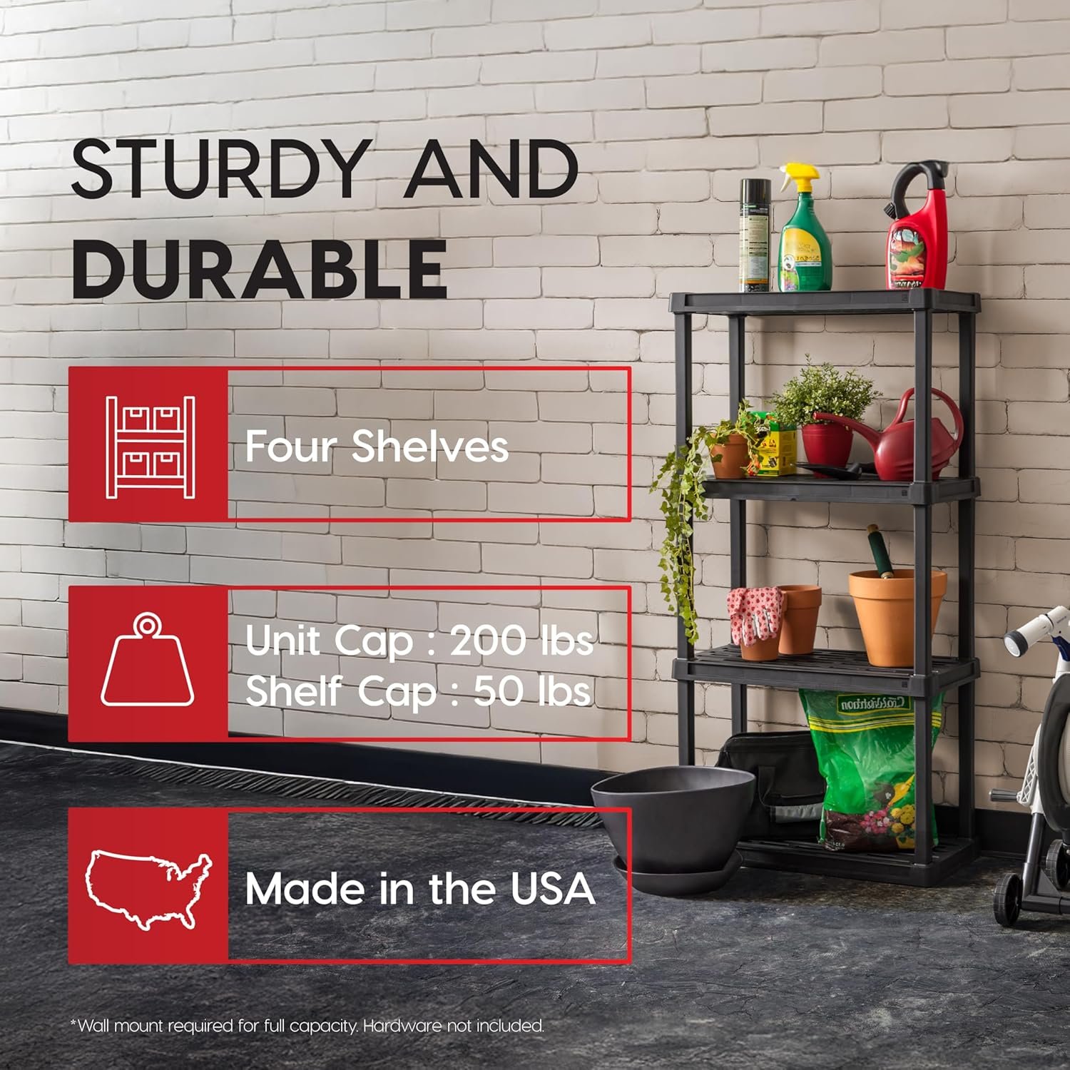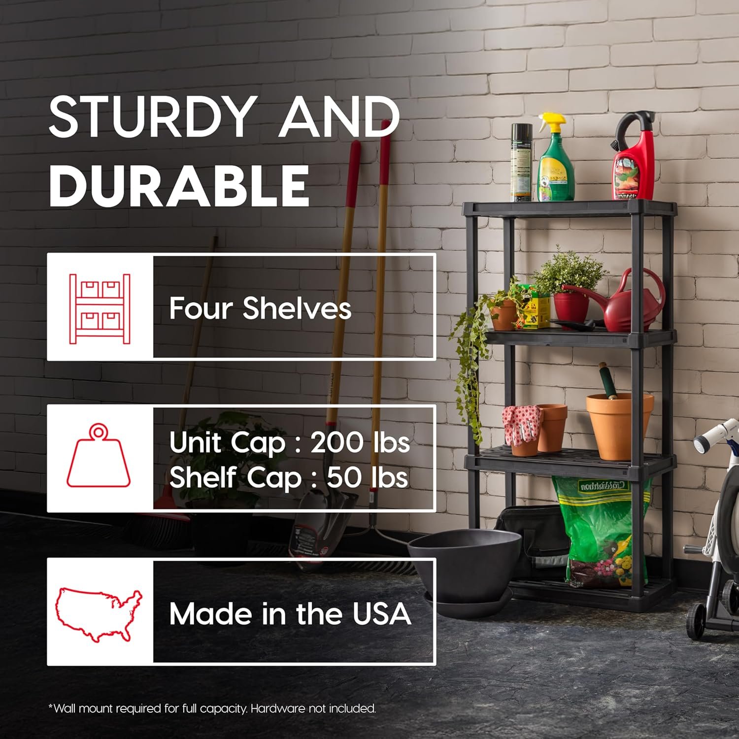 - Lightweight, Yet Durable: Made from recycled materials, this gadget supports up to 200lbs total, or 50lbs per shelf—ideal for garage storage and home organization.